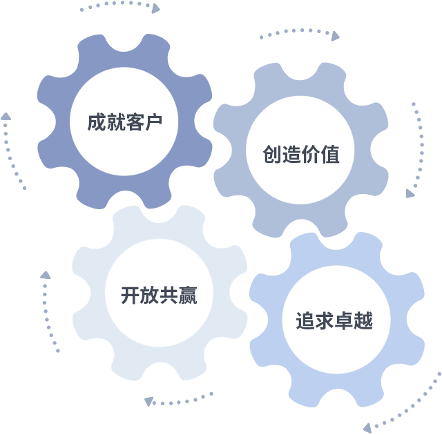 成就客户是一切决策的出发点,,,创造价值是衡量所有工作的标准,,,,追求卓越是我们做事做人的态度,,开放共赢是我们的格局也是最终的结果。。。。价值观的齿轮环环相扣,,,,推动着组织里的每个人不断向前。。。