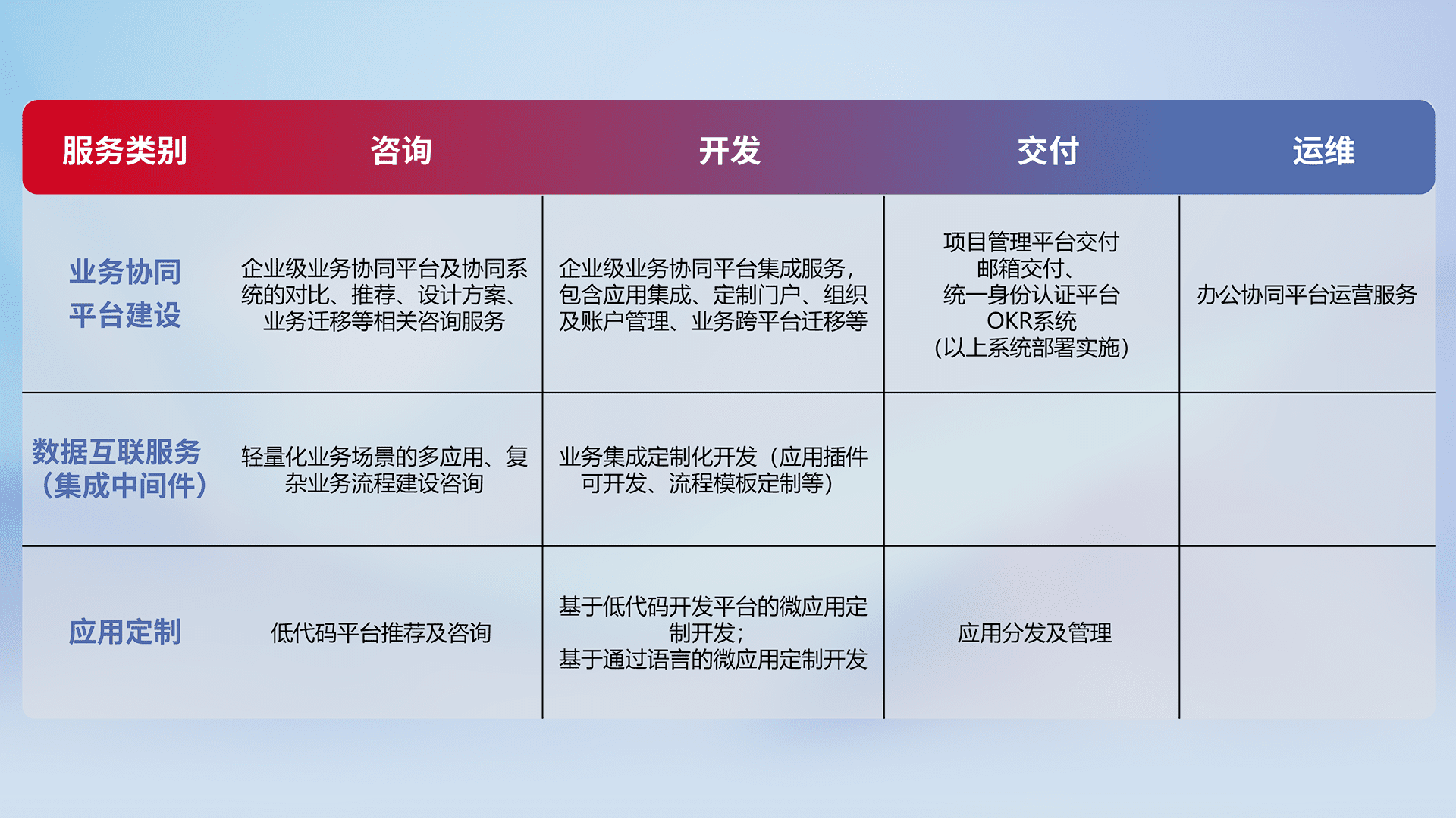 针对钉钉、、、、企微、、、、IDaas等平台级产品提供产品的规划、、、方案、、交付、、、定制化开发等服务,,实现如统一协同办公、、、智能客户服务、、混合会议管理、、智能数据查询、、、等业务场景,,,,实现数字化转型。。。。