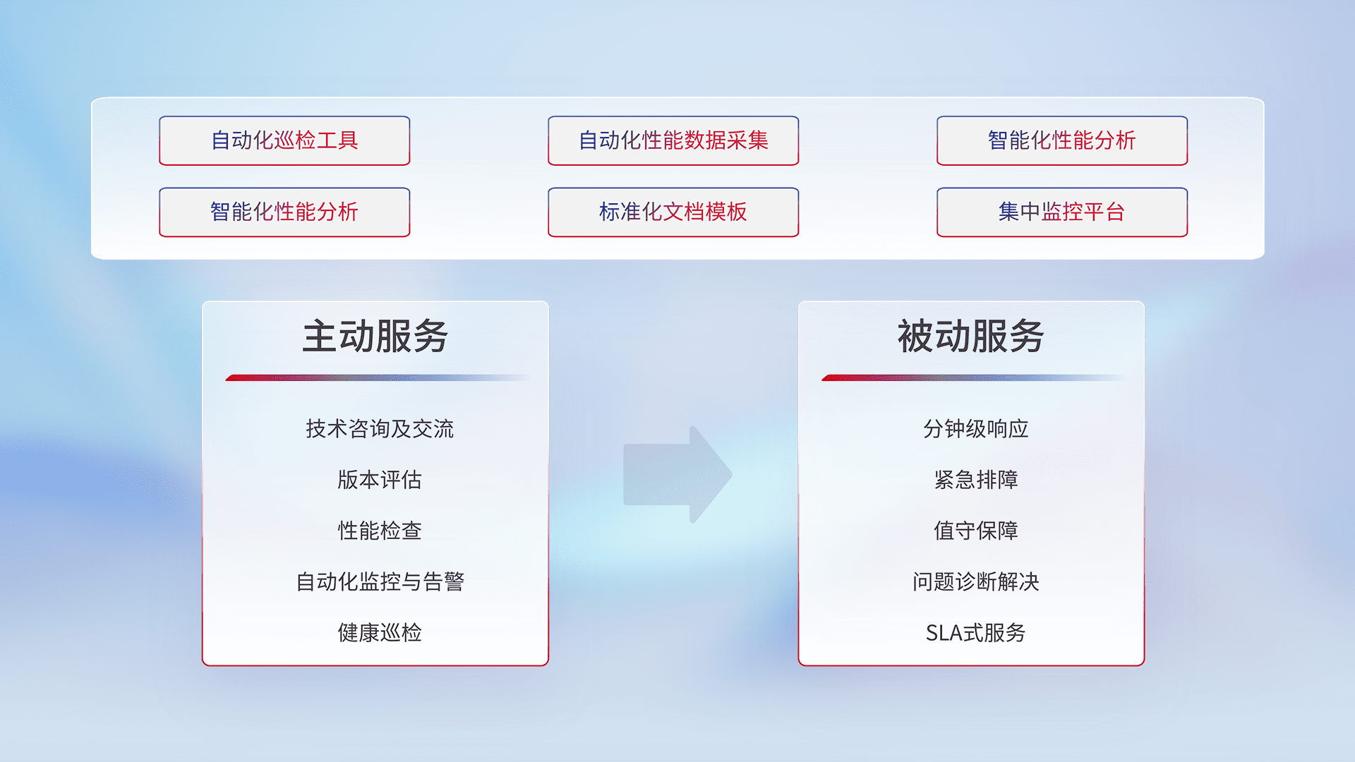 智能化工具和标准化文档,,保障服务质量,,,提供主动服务(包含技术咨询、、、、版本评估、、性能检查、、、、自动化监控与告警、、健康巡检)和被动服务包含(分钟级响应、、、、紧急排障、、、值守保障、、问题诊断解决、、SLA服务)。。。。